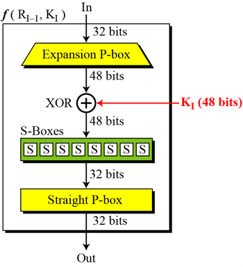 DES함수는 확장 P-박스, 키 XOR, 8개의 S-박스 그리고 단순 P-박스의 4개 부분으로 구성되어 있다.